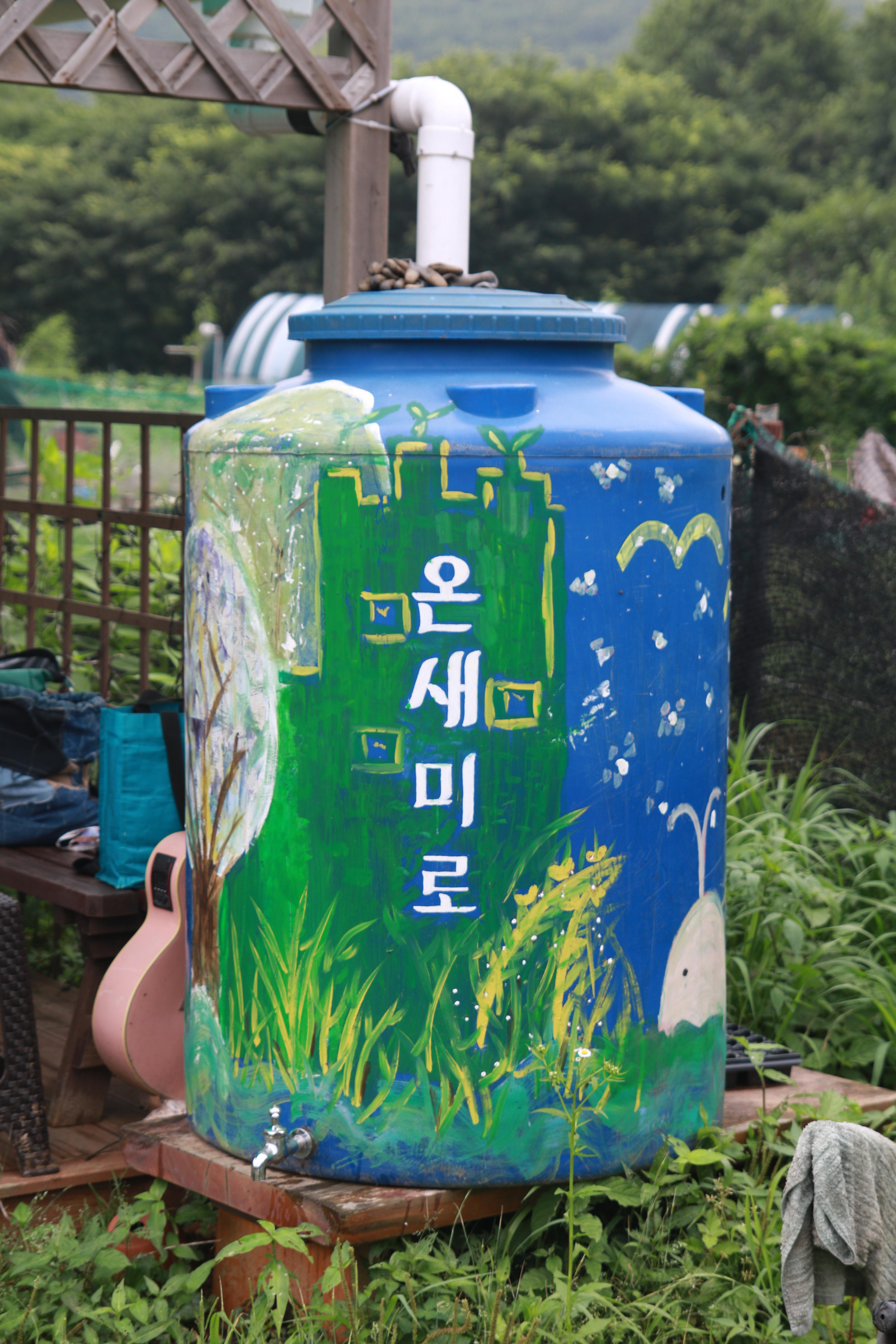 만수마을이음텃밭은 오로지 하늘물로 작물을 키웁니다. 하늘물이란 하늘에서 내려오는 물, 즉 빗물을 말하는 것입니다. 하늘물로 농사를 짓는 일은 자원의 순환을 돕는 일입니다. 지붕을 타고 빗물이 내려오면 아래에 큰 빗물저금통을 연결하여 빗물을 모읍니다. 그리고 그 빗물은 다시 작물을 기를 때 땅으로 들어가게 되는 것이지요. 땅으로 들어간 물은 땅에 머물다가, 지하수로 흐르고, 증발하여 다시 공기 중의 수분이 되며, 또 다시 하늘의 물이 됩니다.