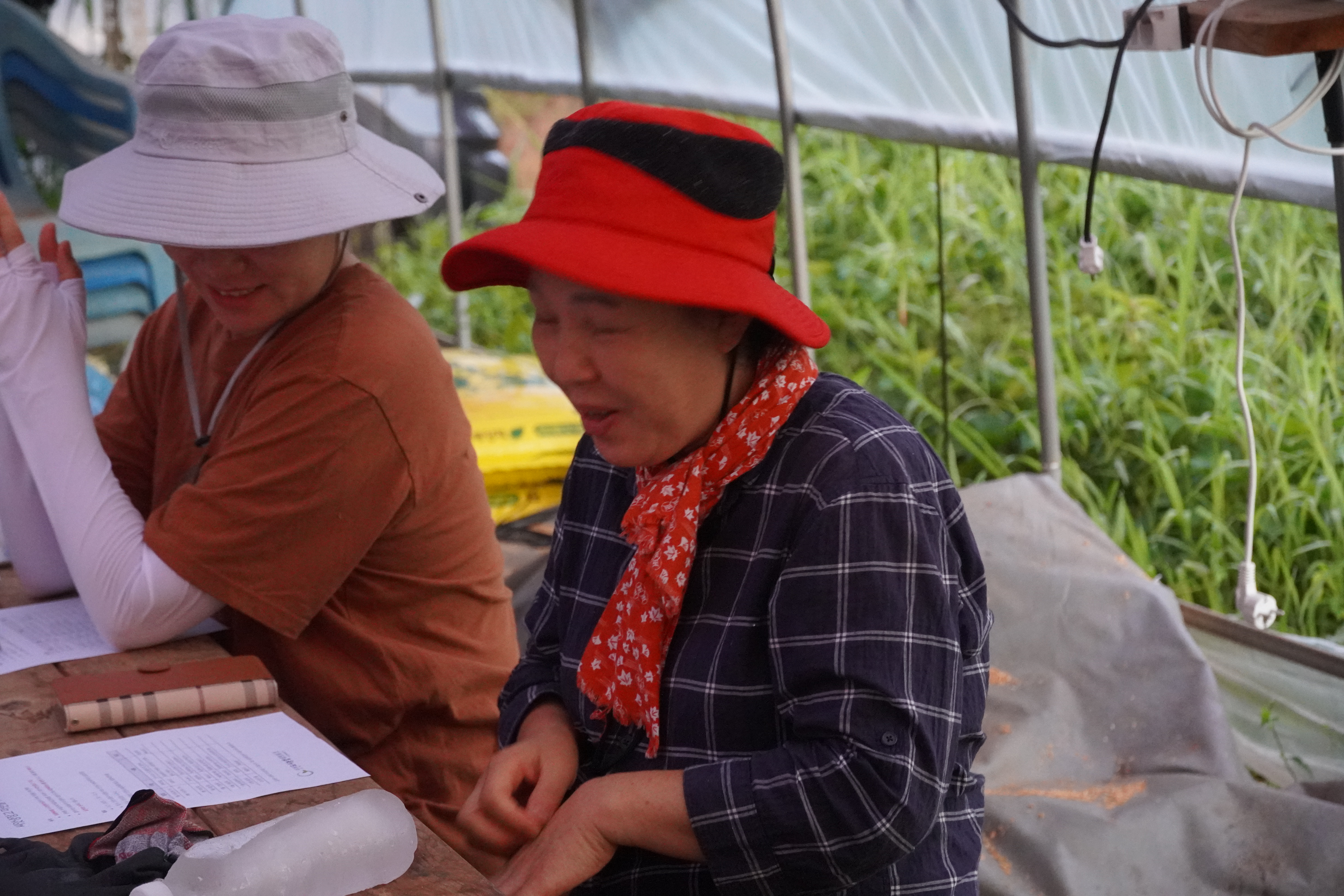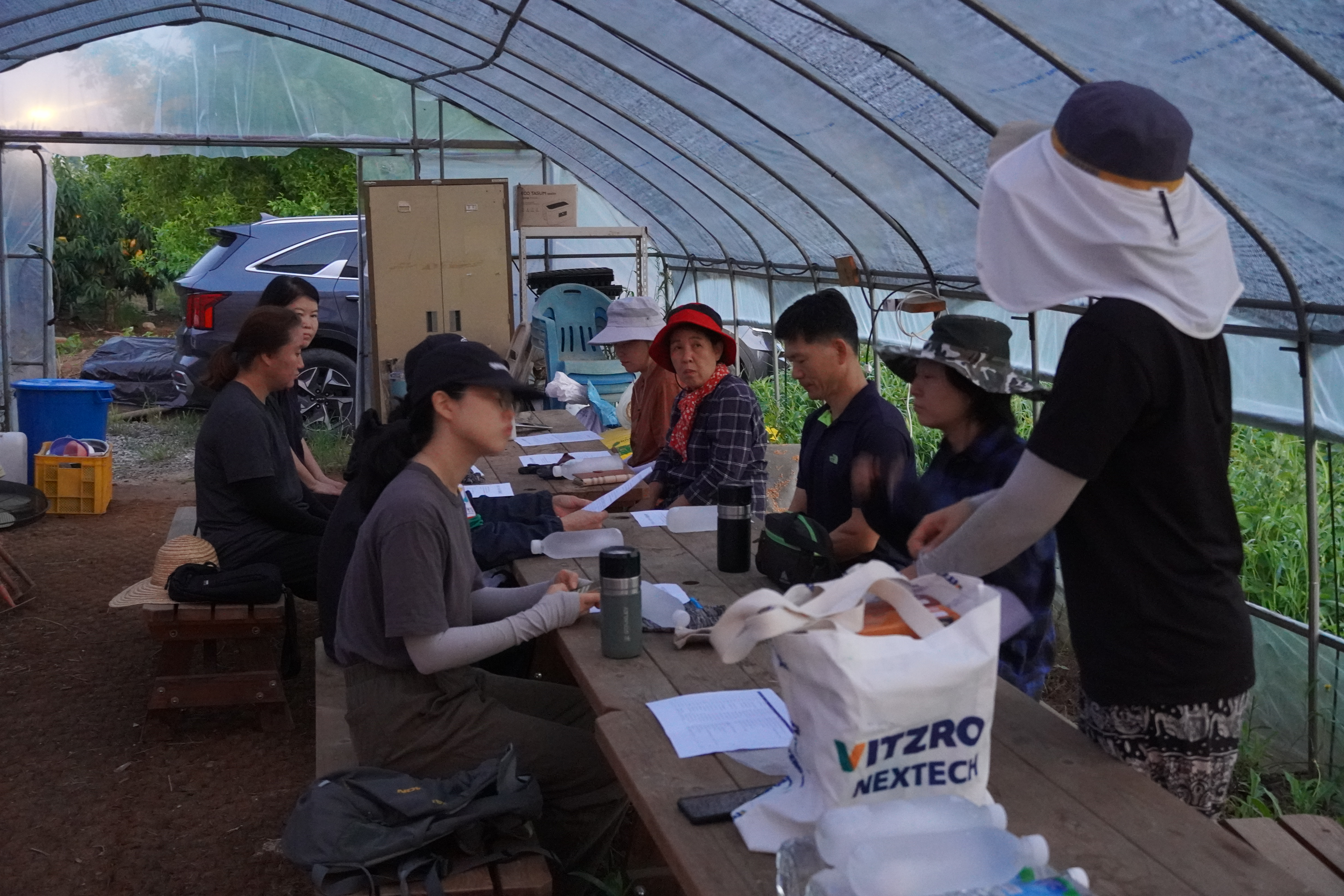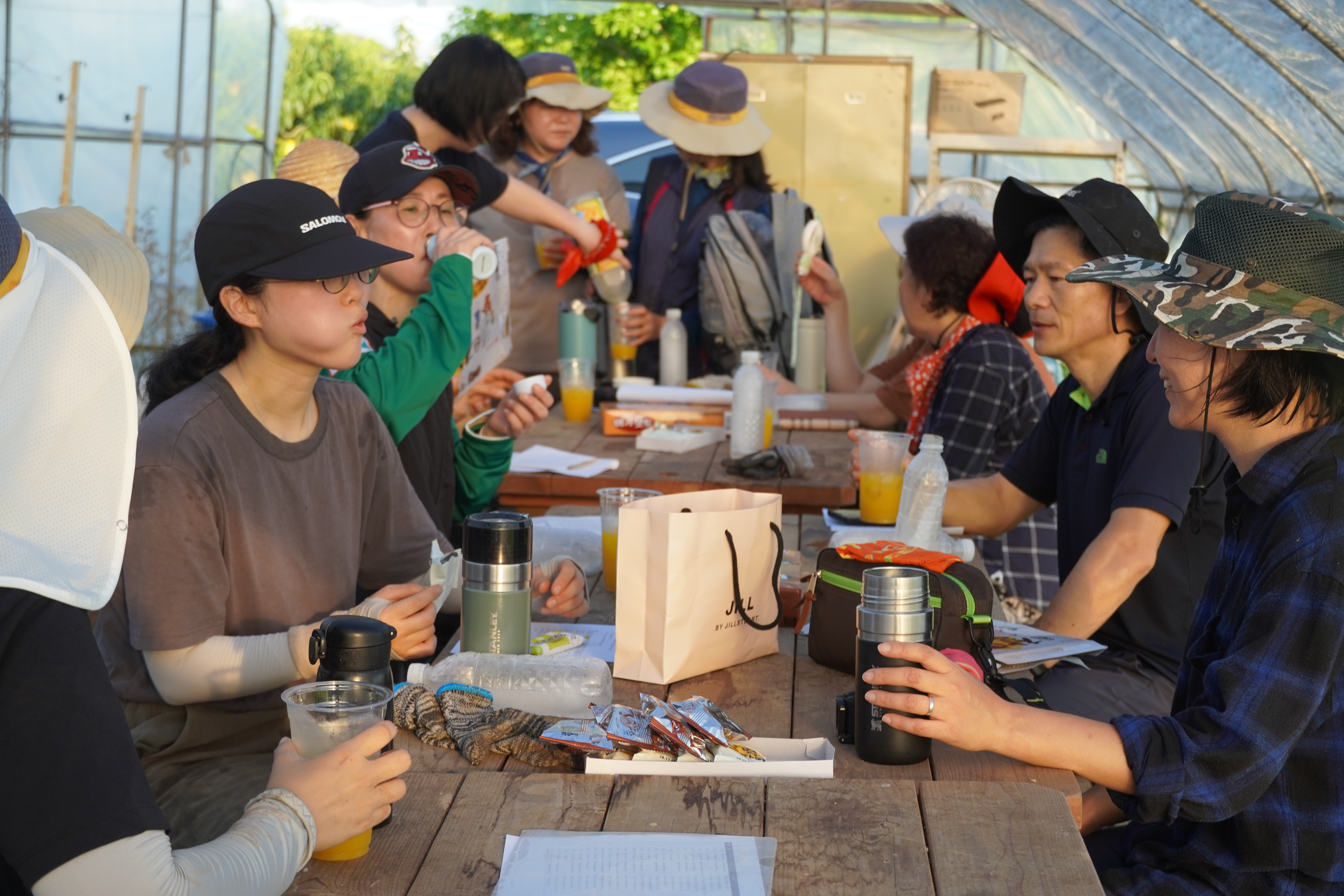 ‘이게 우리 끝날 때까지 녹을까?’ 싶었던 꽝꽝 얼은 물은 농부단에 열정과 뜨거운 날씨 탓에 벌써 녹아버렸습니다. 물을 벌컥벌컥 마시며 마무리 소감을 나누었습니다. 어두운 새벽녘 어색했던 분위기는 사라지고 다들 하하 웃으며 첫 모임이 마무리 되었습니다.