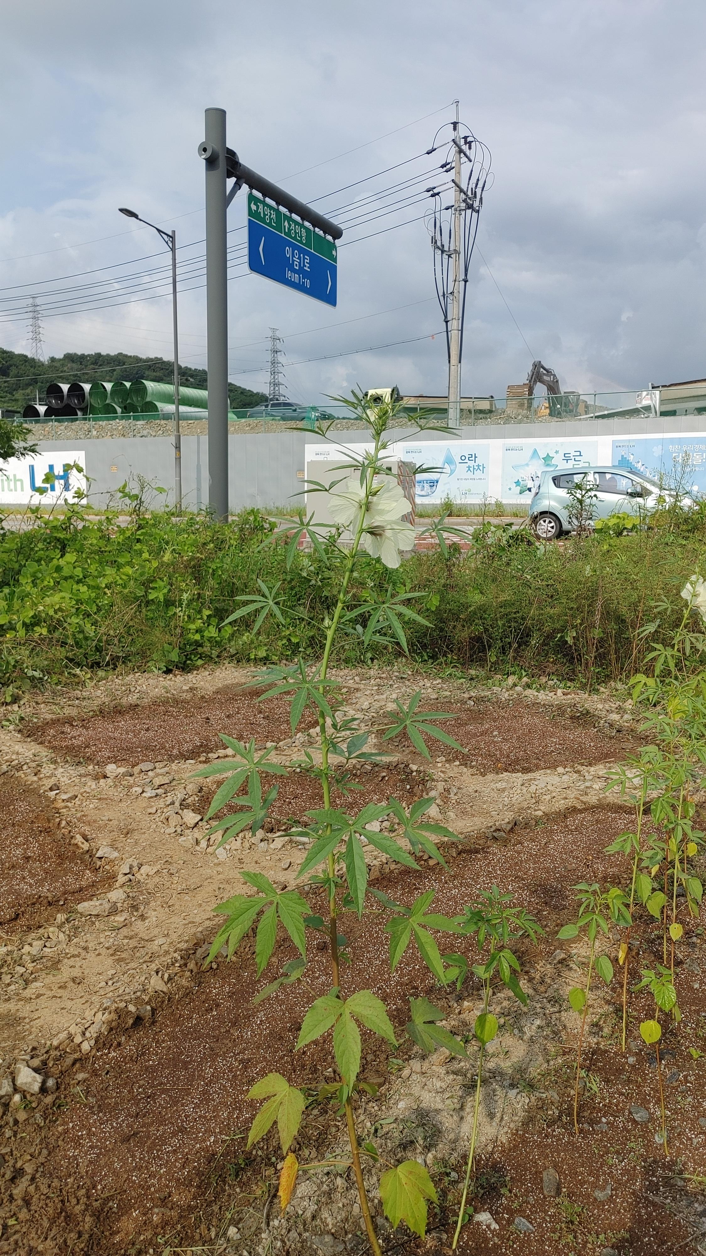 인적이 드물고 풀이 워낙 무성해서 쓰레기는 거의 없었다. 함께 한 멤버 중 한 분이 얼마 전에 케나프를 심어두어서 그 꽃들을 경계삼아 안쪽에 작은 정원을 만들기로 했다. 케나프는 무궁화와 비슷한 모양새로, 자줏빛 심지에 흰색 꽃잎을 가진 예쁜 꽃이다. 이산화탄소 흡수량이 많아 환경 정화에 큰 효과가 있고 척박한 토양에서도 잘 자라며 병충해에 강하다고 한다. 잡초가 숲을 이룬 곳에서도 사람 키 정도까지 자라는 식물이라 정원의 문지기로 손색이 없었다.