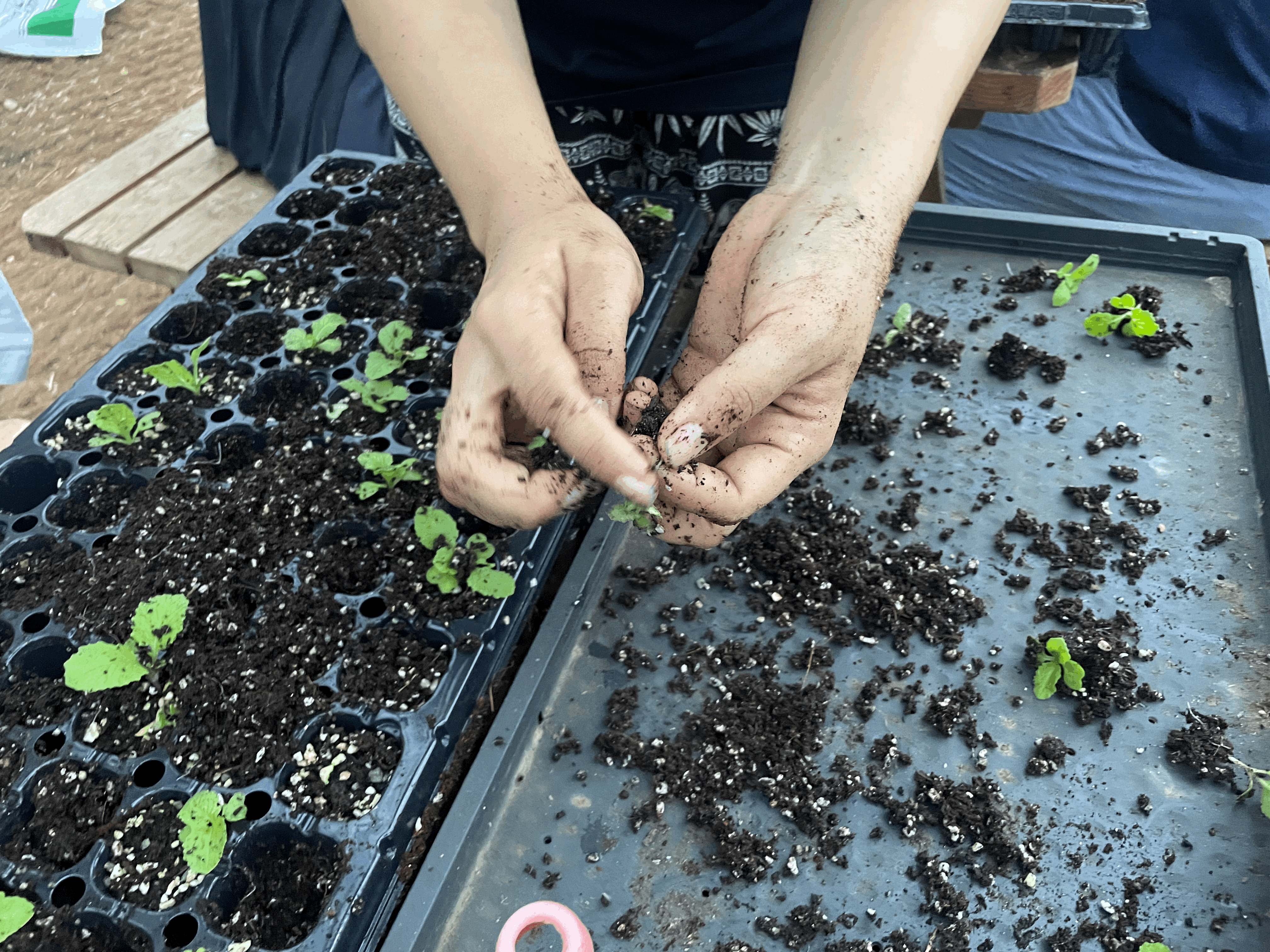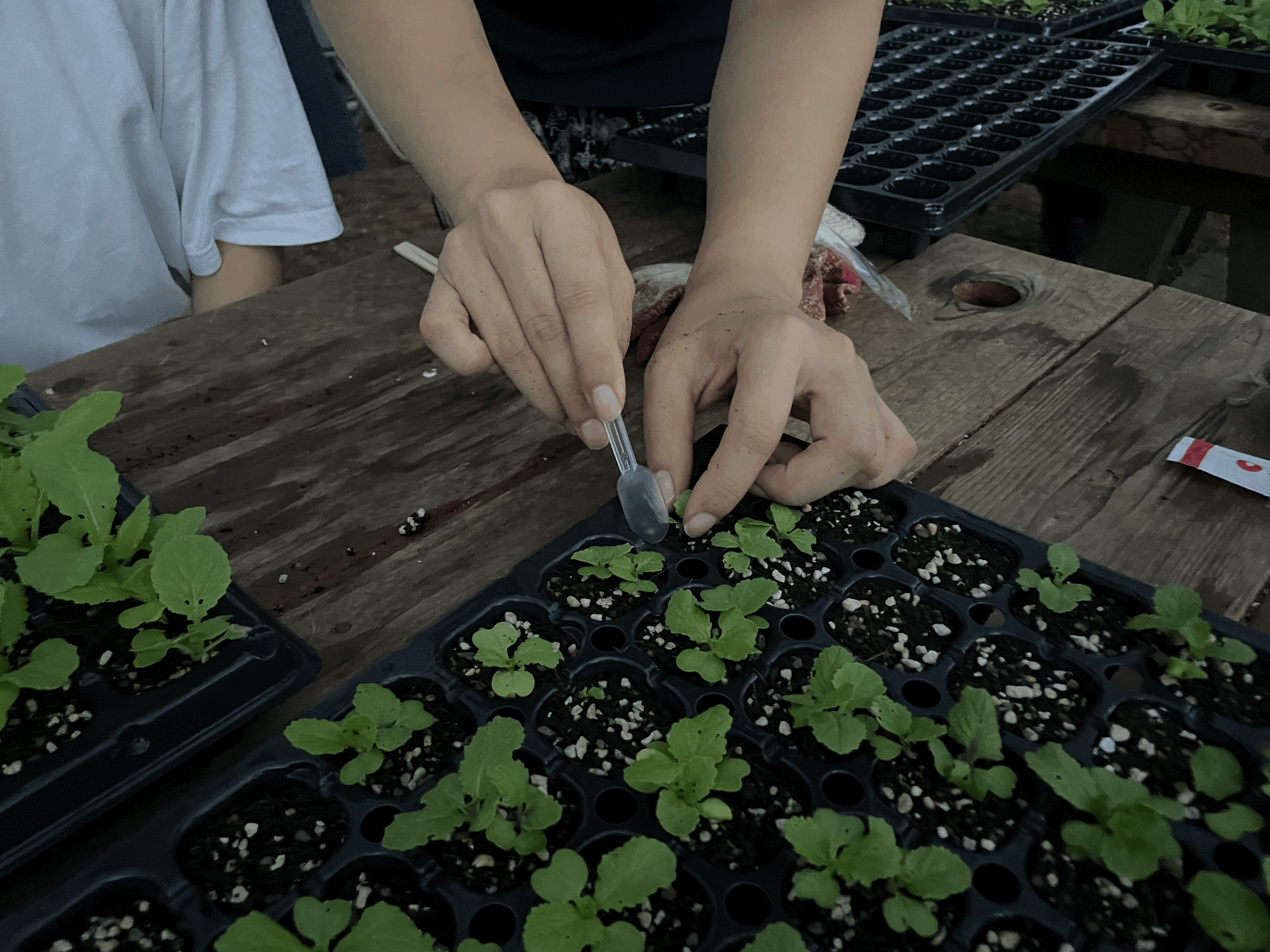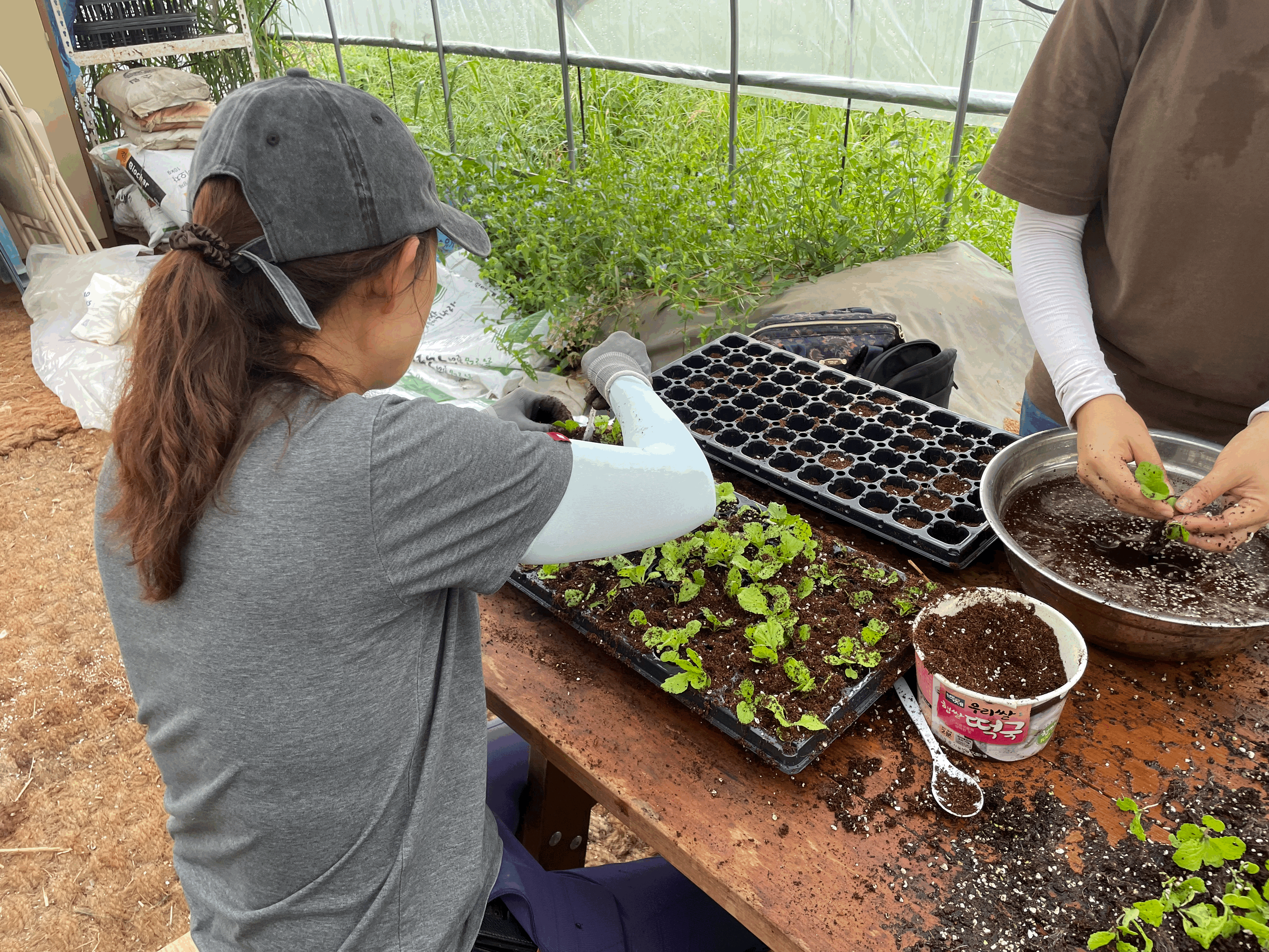 이날은 모여 있던 새싹들을 갈라서 한 구멍에 하나의 배추가 자리하도록 하는 가식 작업을 하는 날이었습니다.