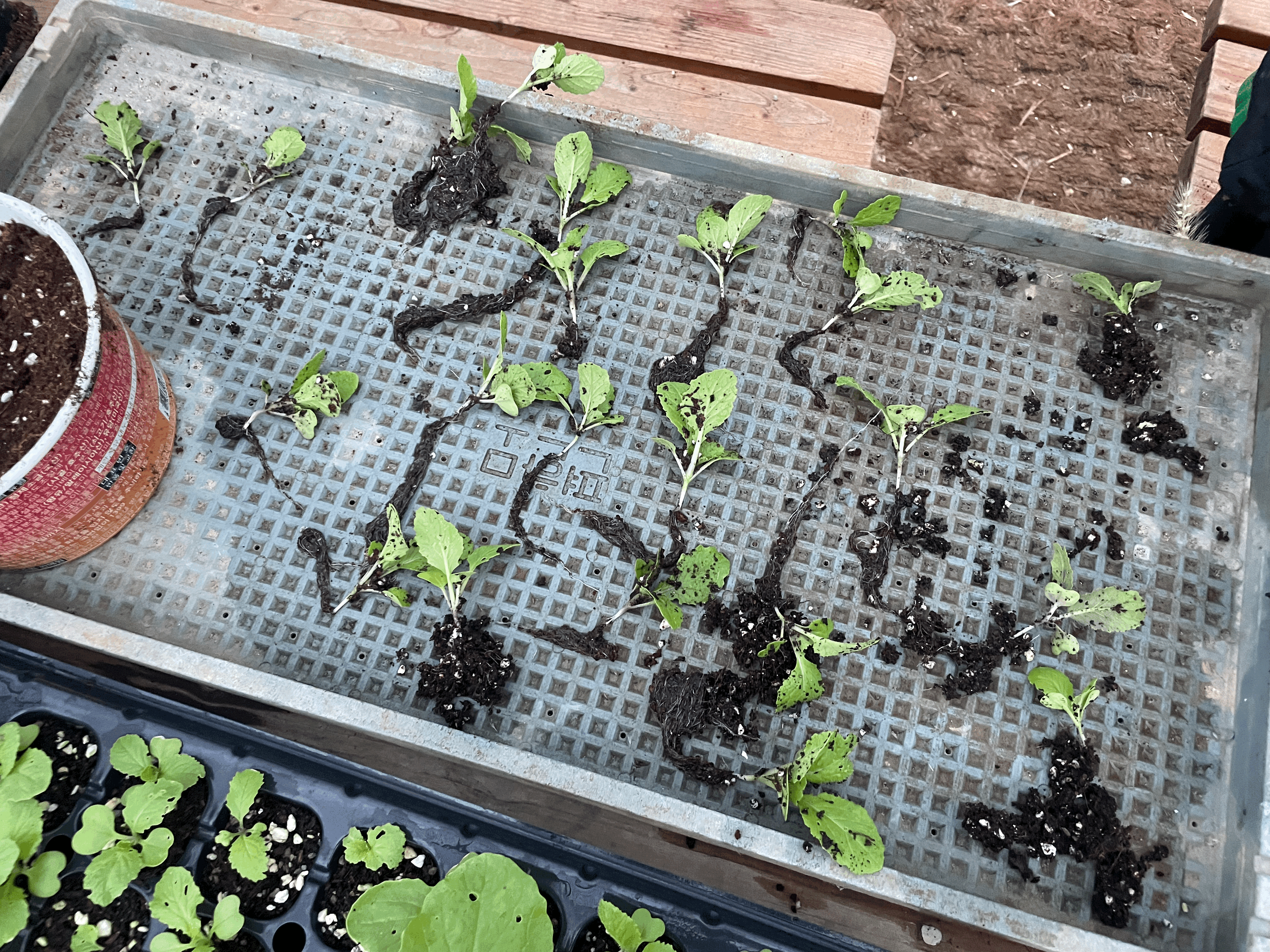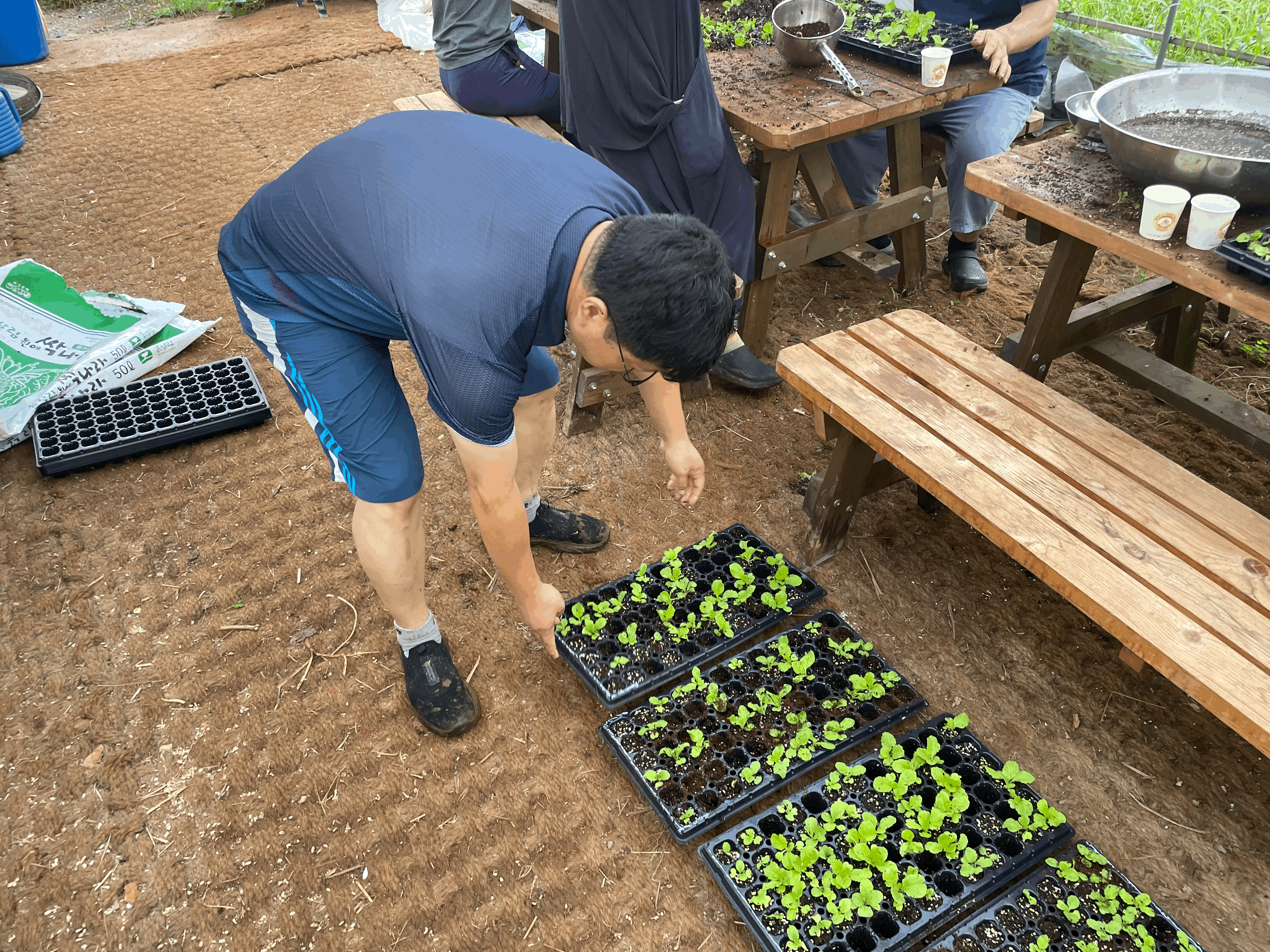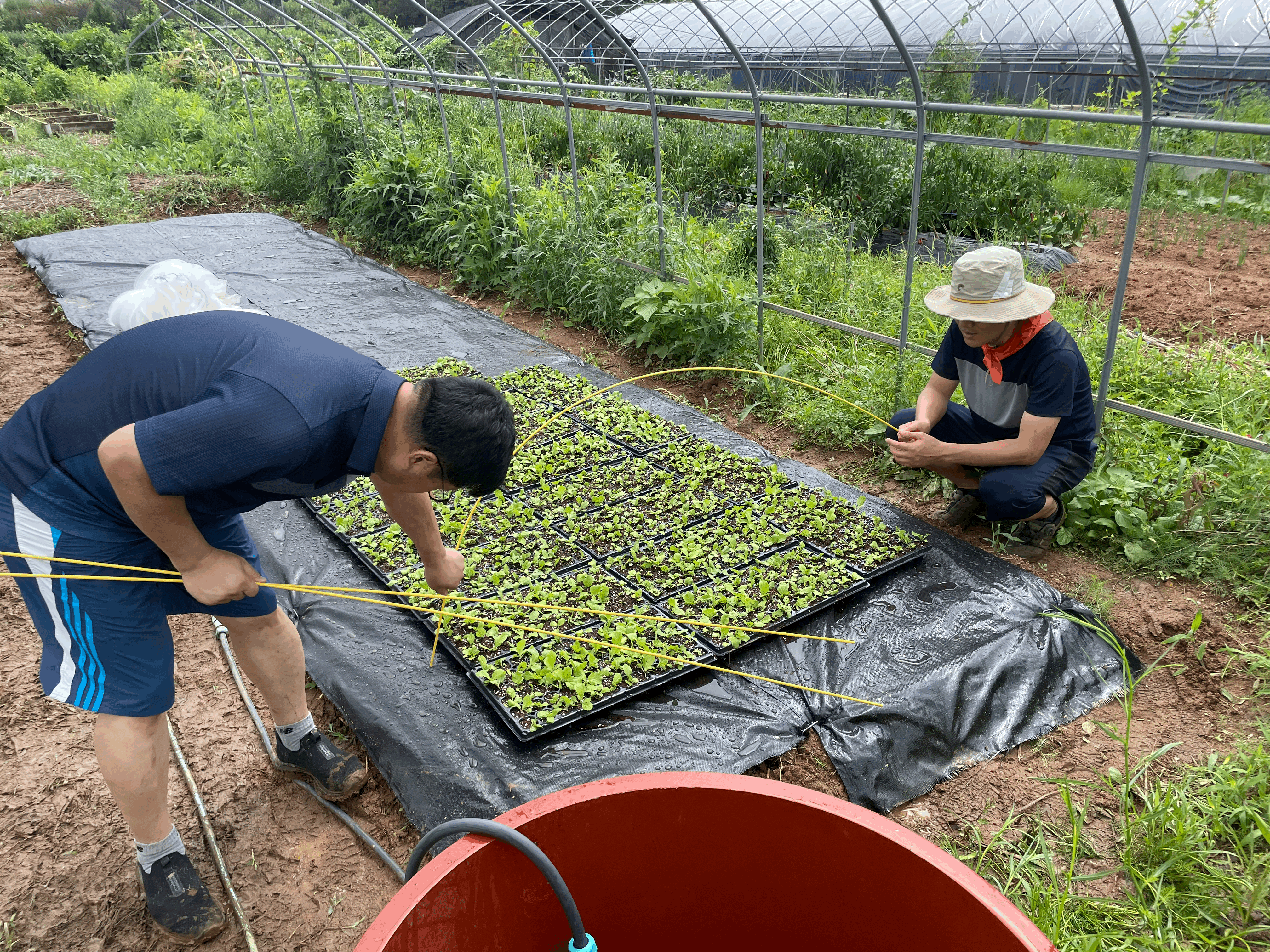 모종개수가 모자란 청방배추는 하나하나 아껴서 모판에 옮겼고, 상대적으로 양이 많았던 구억배추는 뿌리를 가르기도 하고, 두 개 싹이 난 부분을 솎아주기도 하며 마무리 하였습니다. 드디어 영차영차 구억배추와 청방배추 가식작업을 마쳤습니다.